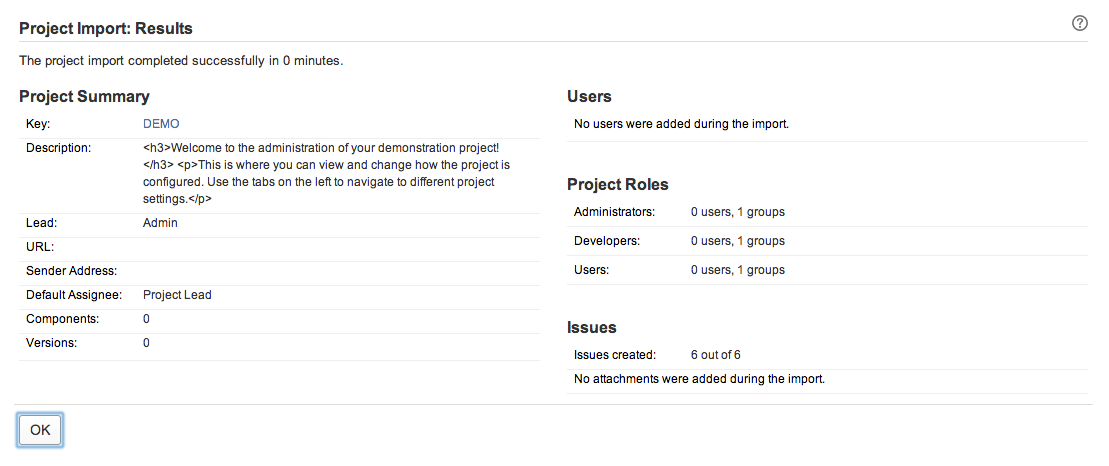 - プロジェクト ツールの実行が終了したら、[OK] を選択し、復元したプロジェクトに移動します。課題、コンポーネント、バージョンが正しく復元されていることを確認する必要があります。すべてのカスタム フィールド データとリンクが正しく復元されていることも確認してください。