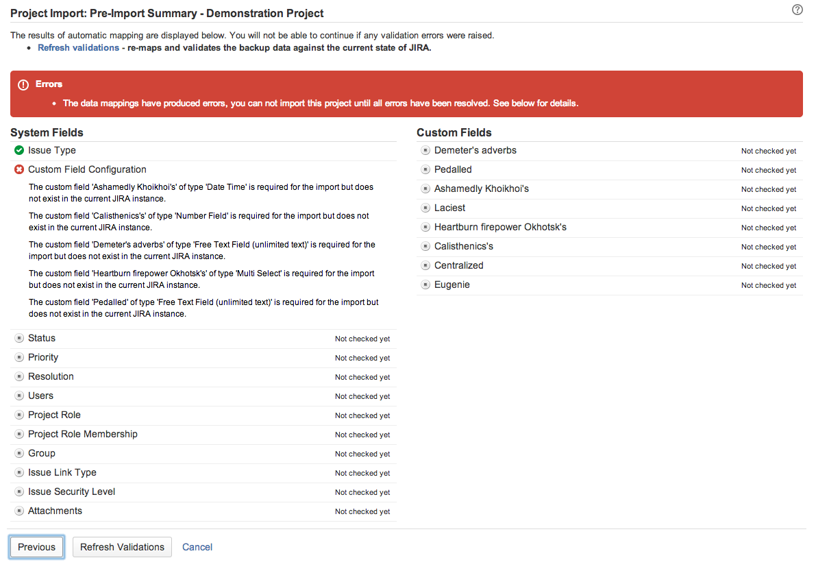 - プロジェクト インポート ウィザードがバックアップからプロジェクトをインポートするのに必要なデータマッピングの検証を試みます。ウィザードのこの手順では検証を確認することができ、必要に応じて対象 Jira インスタンスを修正することができます。