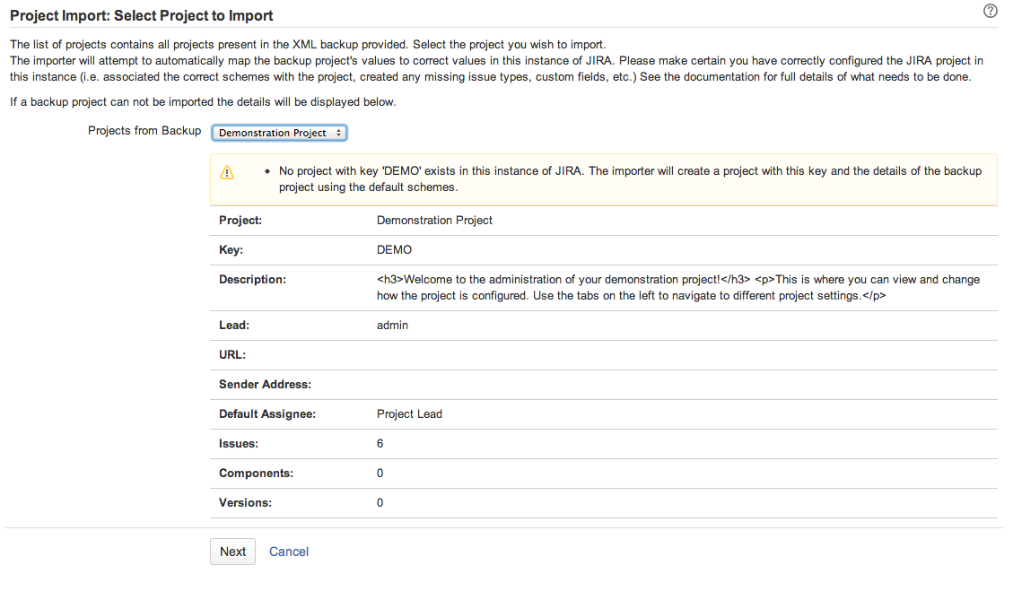 プロジェクト インポート ツールの主要なタスクが、バックアップ プロジェクトからデータをターゲット Jira インスタンスに復元することであることに注意が必要です。ターゲット Jira インスタンスにプロジェクトが 1 つも存在しない場合、プロジェクト インポート ツールはプロジェクトを作成できますが、データに影響を与える構成設定(たとえば、画面スキーム)を再現することはしません。元のプロジェクトの任意の構成設定を保持したい場合、バックアップ プロジェクトからデータをインポートする前に、必要な構成設定を行ったターゲット インスタンスに空のプロジェクトを作成することをお勧めします。