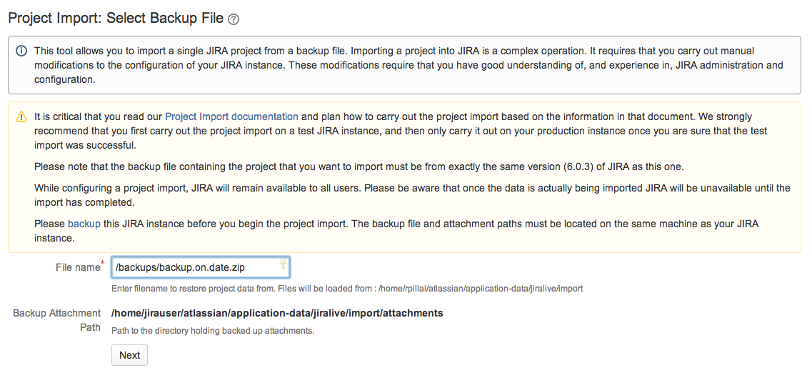 バックアップからのプロジェクトの復元は簡単な作業ではありません。プロジェクトのインポートに対応するために、ターゲット JIRAインスタンスの構成を変更する必要があります。さらに、大規模なプロジェクトをインポートする場合、プロジェクトのインポートデータのマッピングは、ハードウェア上のリソースを大量に消費する可能性があり、完了するまでに長時間かかる場合があります。