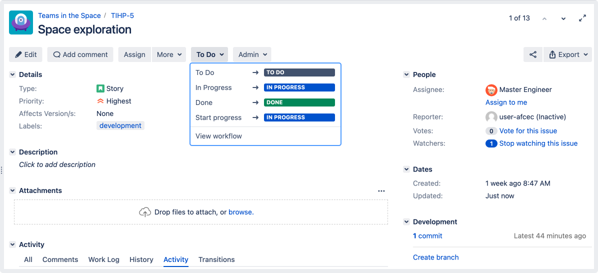 課題を表示すると、[ワークフローのトランジション] メニューからすべてのワークフロー トランジションを利用できるようになります。