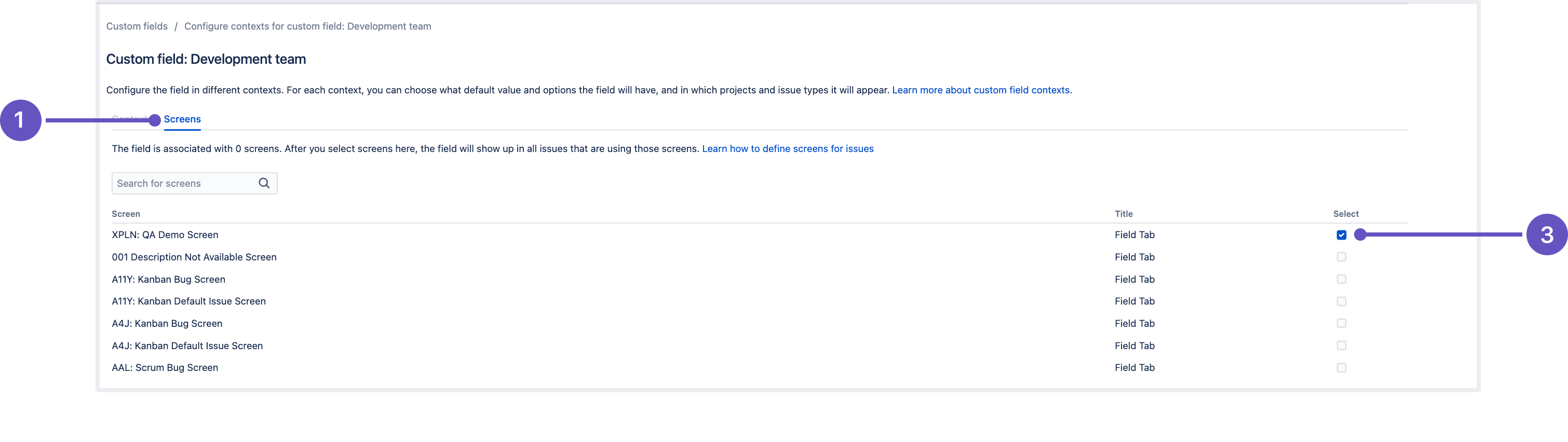 [選択] チェックボックスを使用すると、コンテキストを設定するカスタム フィールドに画面を関連付けることができます。