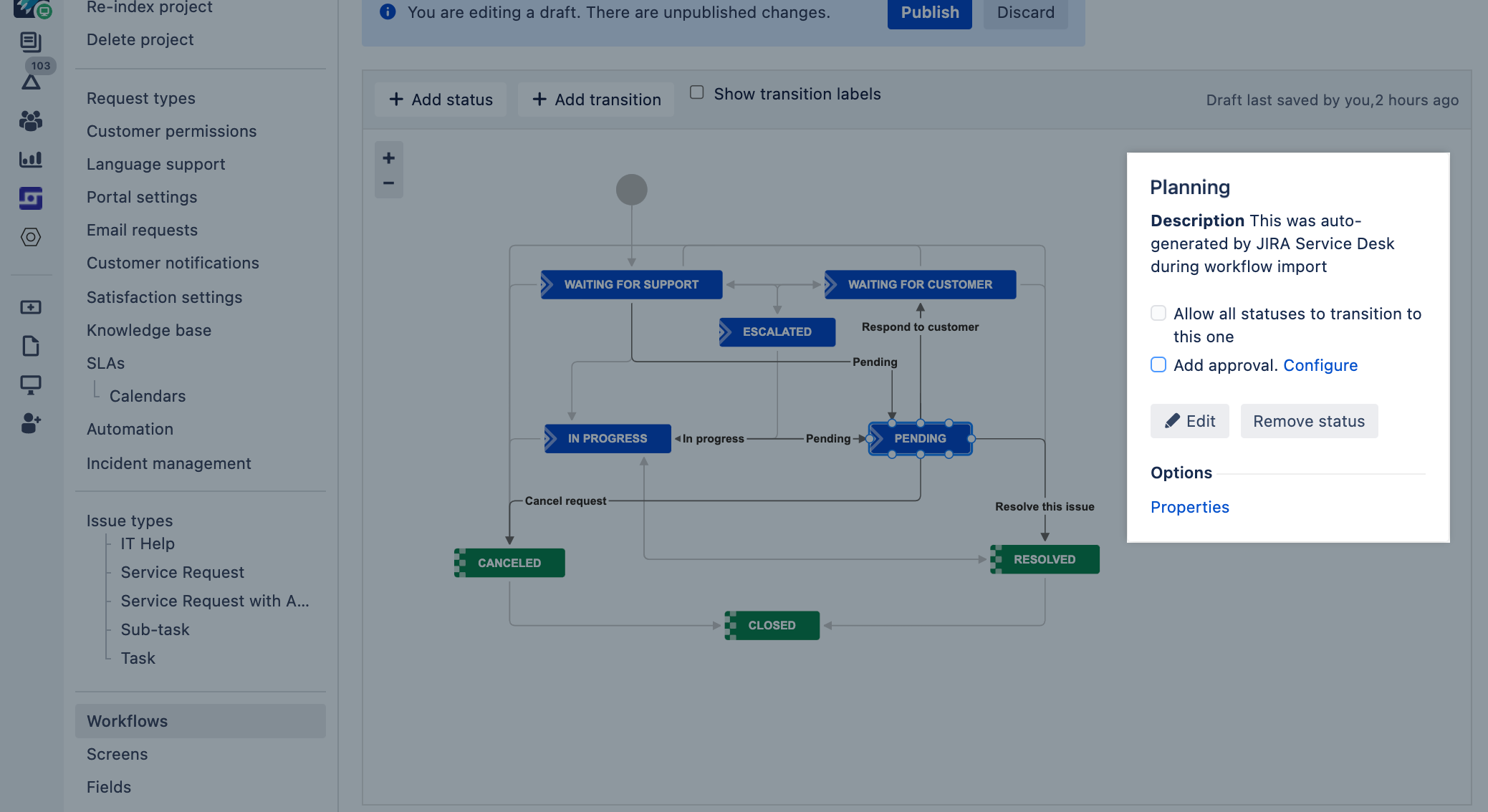 Jira Service Management では、ワークフローのステータスに承認ステップを追加して、このワークフローを使用している課題タイプに承認が必要かどうかを指定できます。これによって、次のステップに進む前に、リクエストが適切な担当者によって確認されて承認されるようになります。
