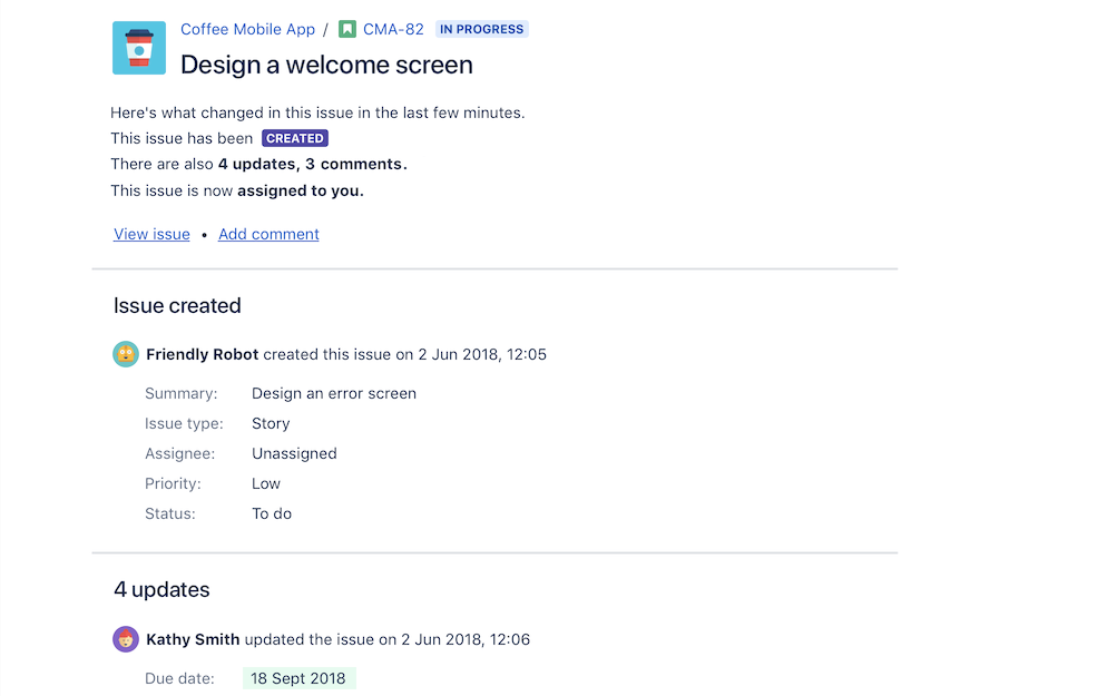 Jira がバッチ処理された課題通知を導入したときに、その違いが明確になりました。バッチ処理された課題通知は、一定の期間中に発生した課題の更新を 1 つの要約メールにまとめることで、Jira から送信されるメールの数を減らすことを目的に導入されました。