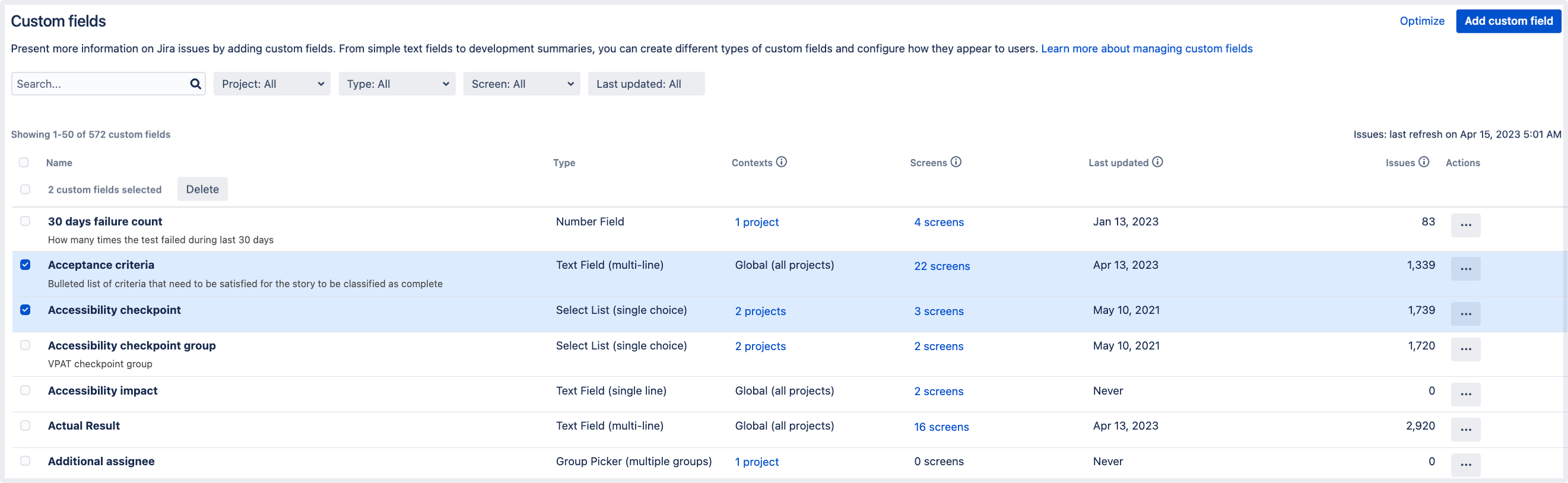 フィルターを使用して、削除するカスタム フィールドを検索します。使用状況列 (課題、最終更新日) で並べ替えて、あまり頻繁に使用されていないカスタム フィールドを検索することもお勧めします。