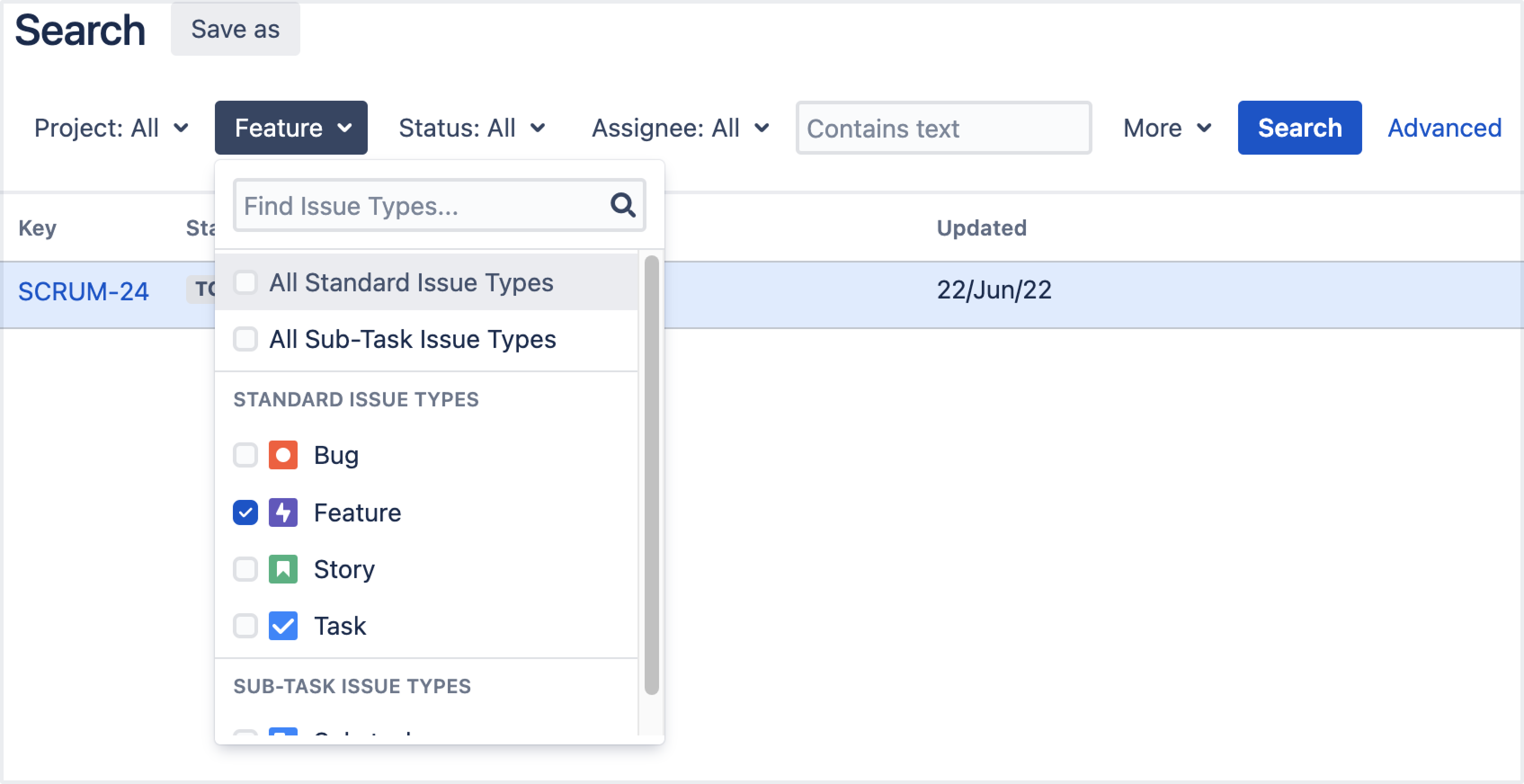 この結果、フィールド Epic Link は Feature Link という名前になりました。ただし、このフィールドを詳細検索で使用する場合は、フィールドの元の名前を使用する必要があります。