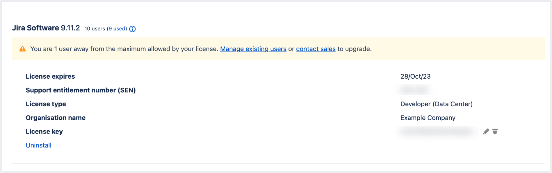 ライセンスの最大ユーザー数に近づくと、アップグレードを促すバナーが表示されます。[アップグレード] ボタンを選択すると、アトラシアンの注文フォームに移動します。