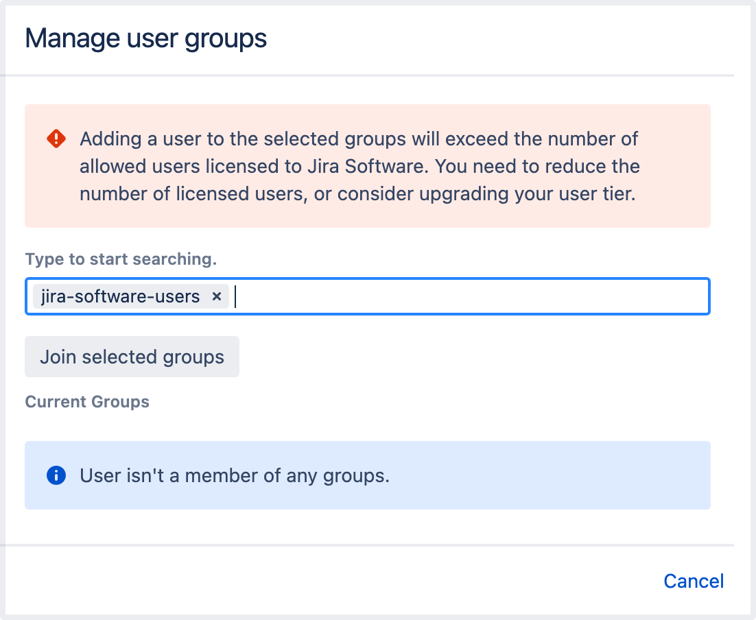 上限を超えるユーザーをいずれかの Jira グループに追加しようとすると、制限違反に関する次の警告メッセージも表示されます。