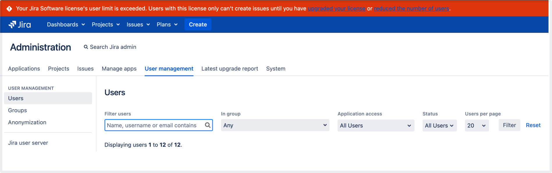 ユーザー数が Jira アプリケーションのライセンスで許可されている人数を超えた場合、ユーザーは課題を作成できなくなります。これを防ぐためには、最大ユーザー数の多いライセンスにアップグレードするか、利用ユーザー数を減らす必要があります。