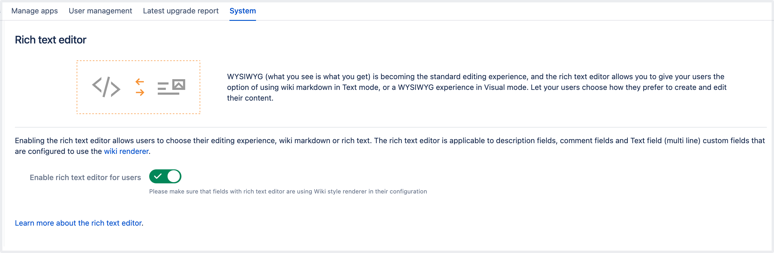 リッチ テキスト エディターは、説明フィールド、コメント フィールド、Wiki レンダラーを使用するすべてのテキスト フィールド (複数行) の各カスタム フィールドで利用できます。
