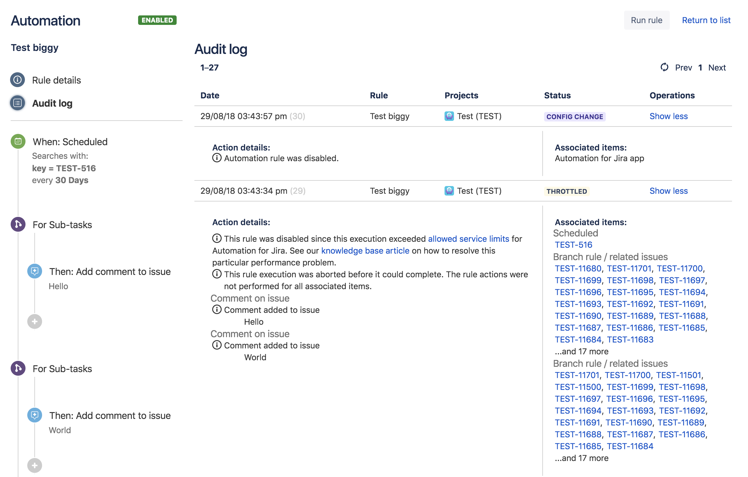 Jira Automation には、自動化ルールを抑制するための一連のサービス制限が用意されています。ルールがこれらの制限に違反すると、Jira インスタンスに影響を与えないように調整されて無効化されます。