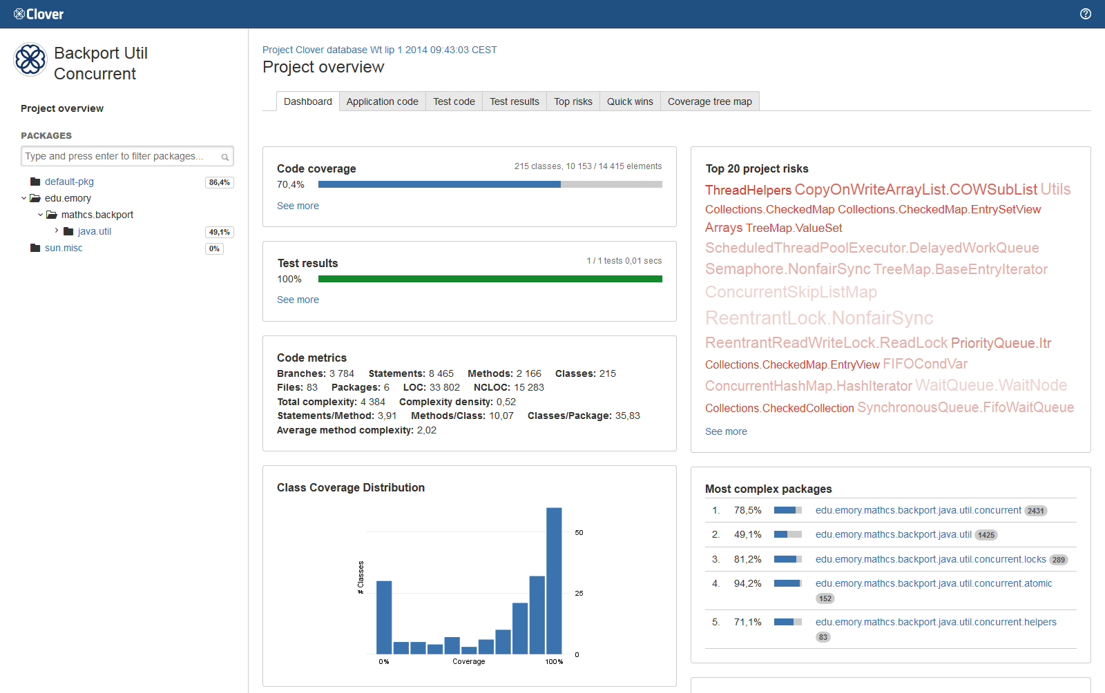 Clover HTML レポートの内容の詳細については、「Clover ドキュメント ホーム - 4. レポートの理解」ページをご覧ください。完全を期すため、Clover コード カバレッジ HTML レポートの例を以下に示します。