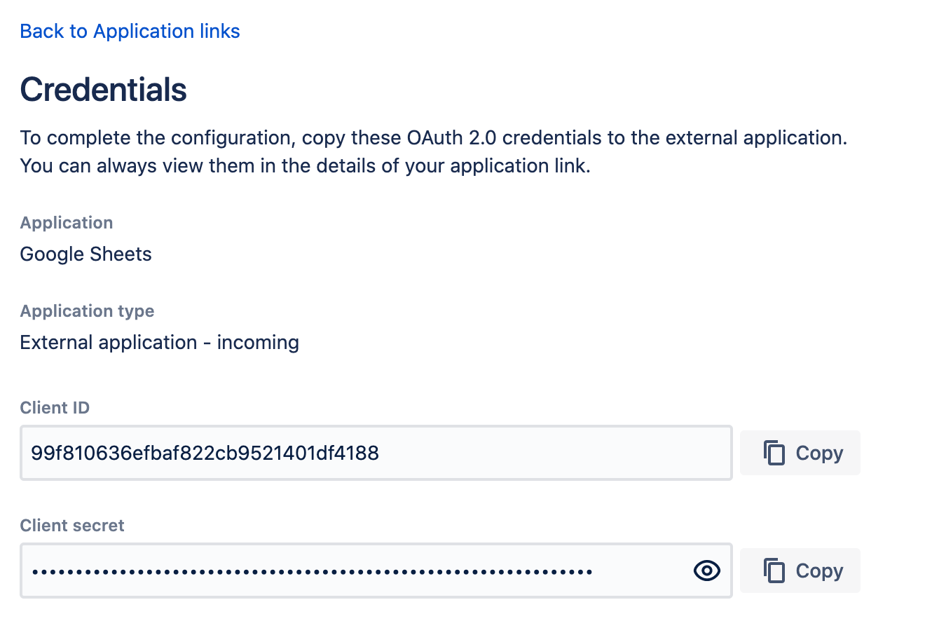 The incoming application link is now set up. You can view its details on the Application links administration page, including the OAuth credentials in case you needed to access them later.