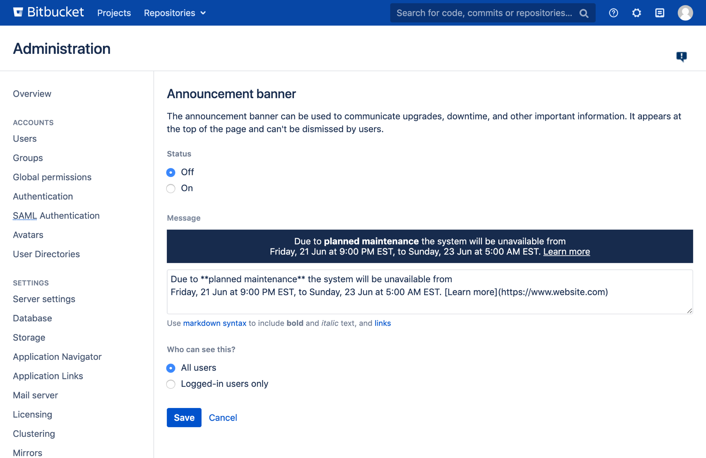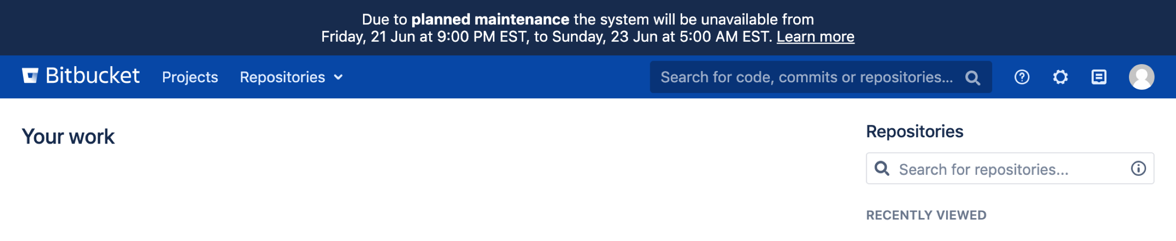 An announcement banner is a great way to communicate important information like scheduled downtime or upcoming maintenance periods. When turned on, it appears in Bitbucket Data Center at the top of every page until you turn it off, helping to make sure you get your message out.