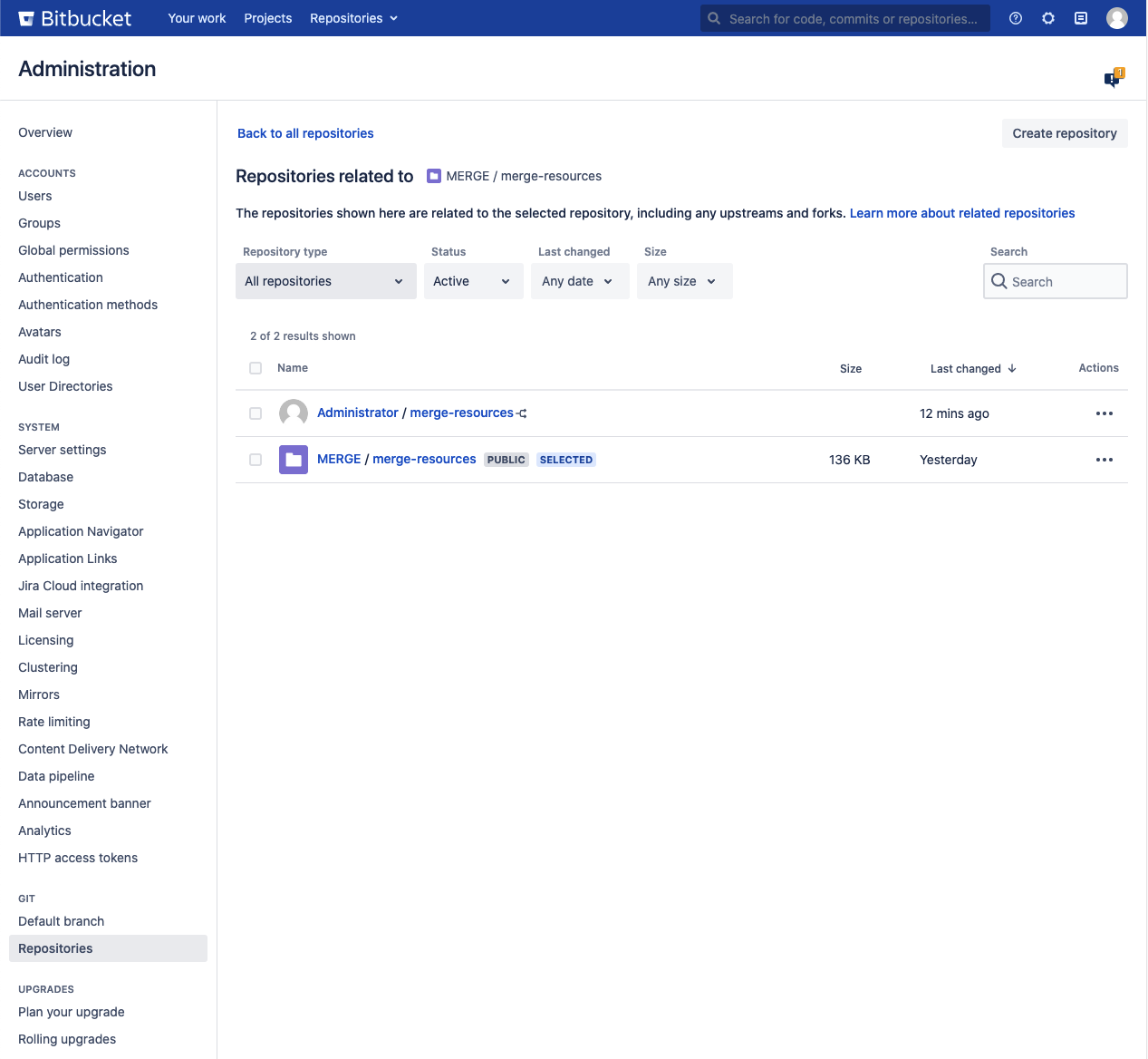 In Bitbucket Data Center, you can manage all of the repositories in your instance from the Repositories page in the Administration area. You can also create a new repository from here.