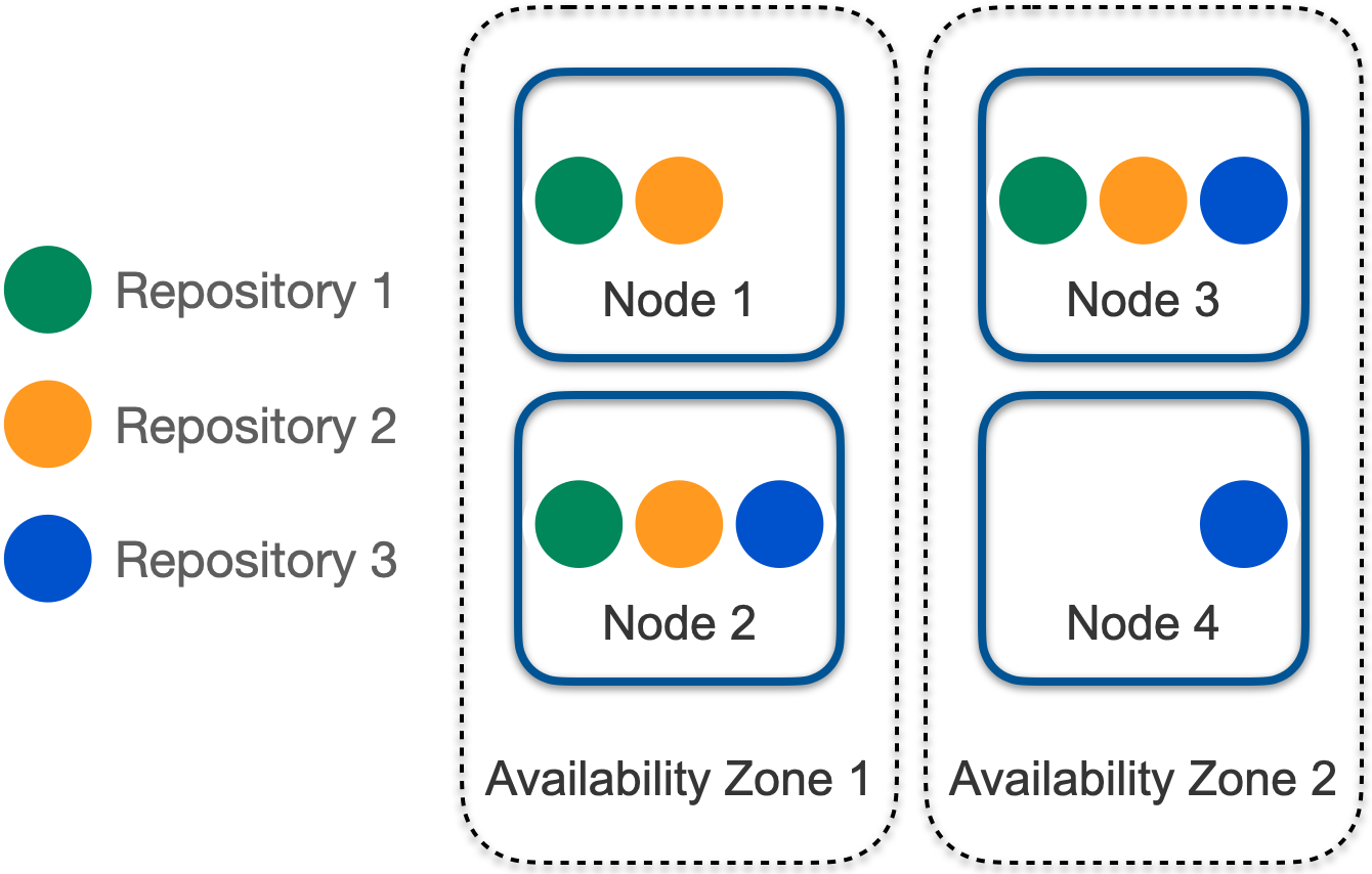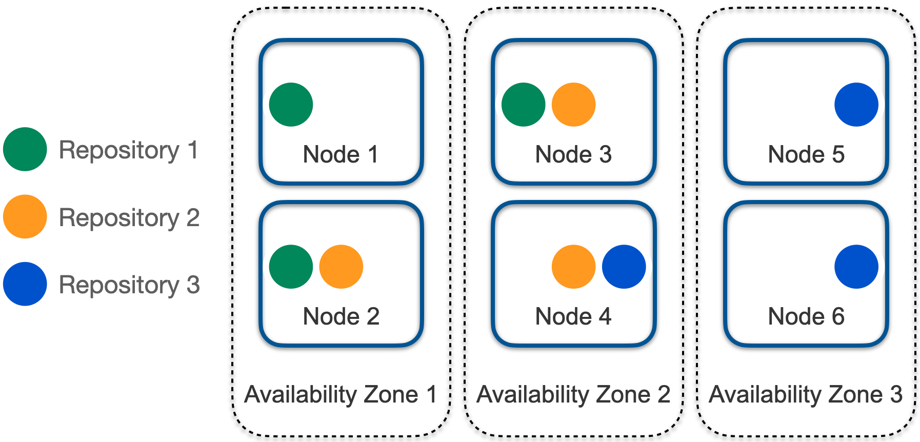 Take the scenario in Figure 10. For a replication factor of three, each replica can be placed in a separate availability zone. However, as illustrated, this hasn’t happened. An outage in any availability zone will result in one of the three repositories not being able to form a quorum for writing.