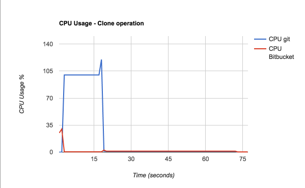 Since cloning a repository is the most demanding operation in terms of CPU and memory, it is worthwhile analyzing the clone operation a bit closer. The following graphs show the CPU and memory usage of a clone of a 220 MB repository: