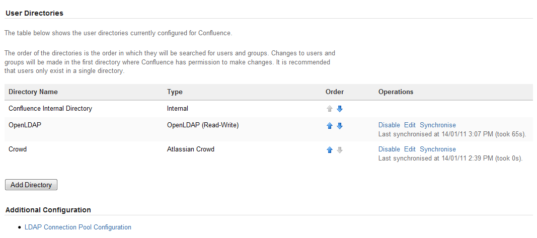 外部ユーザー ディレクトリは必要なだけ追加できます。また、ディレクトリの順序も定義できます。これにより、ユーザーおよびグループ情報を検索する際に、Confluence が最初に検索するディレクトリが決定します。「複数のディレクトリの管理」を参照してください。