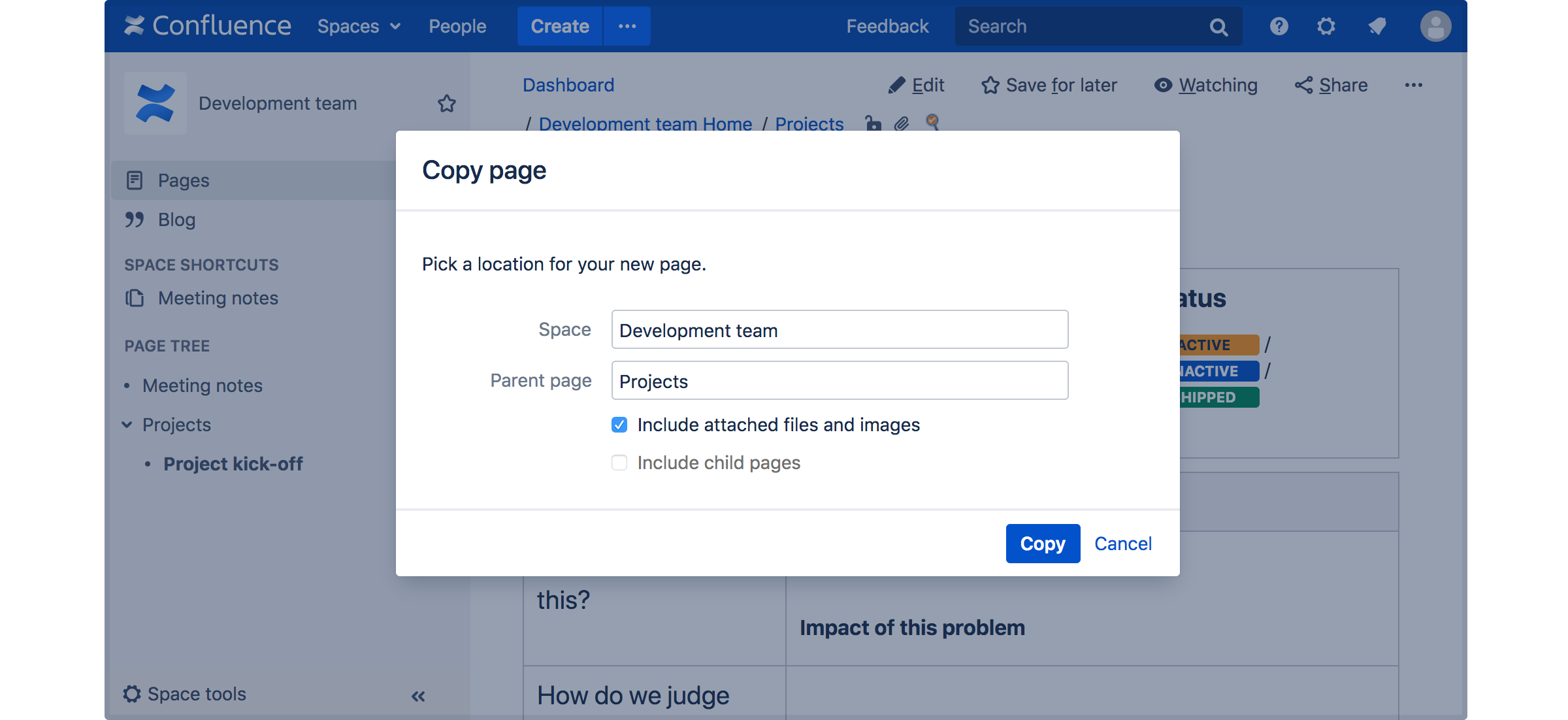 - ページをコピーするには、コピー先のスペースでのページの '作成' 権限が必要です。