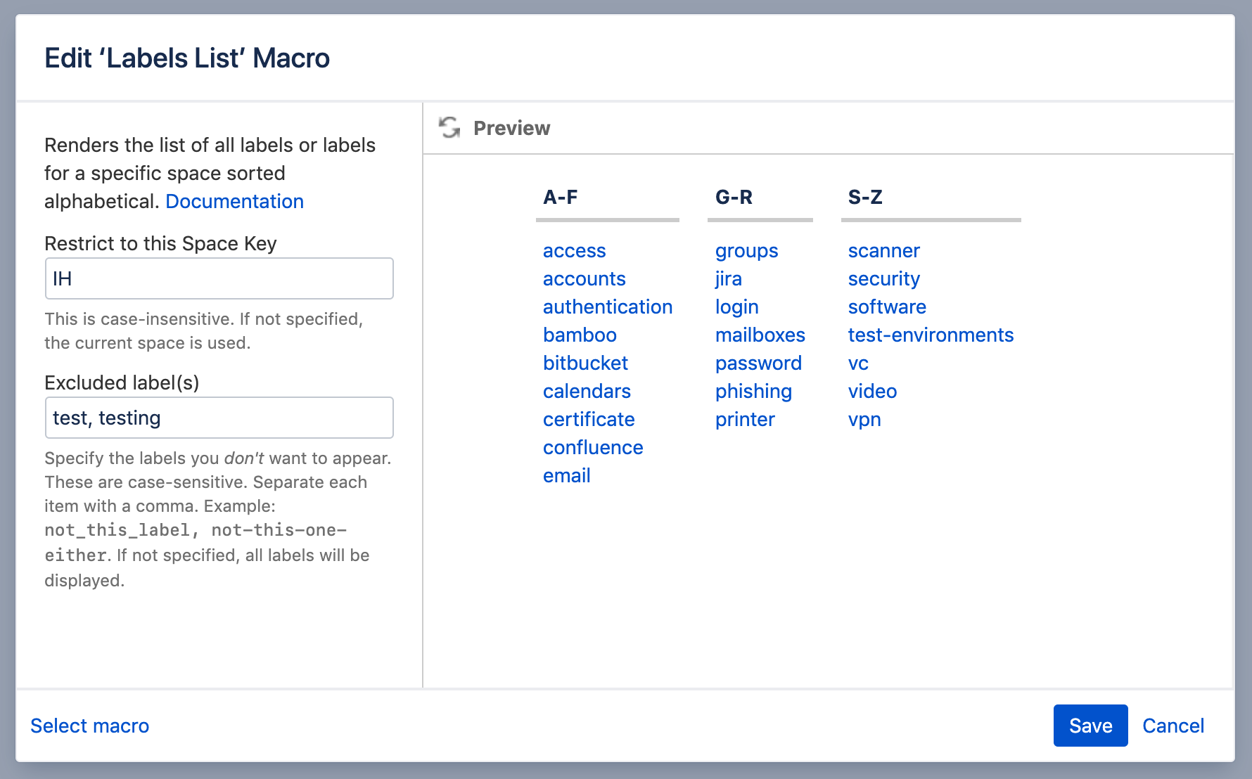 スクリーンショット: IT Help スペースのラベルを表示し、"test" および "testing" のラベルを除外する、ラベルのリスト マクロ。