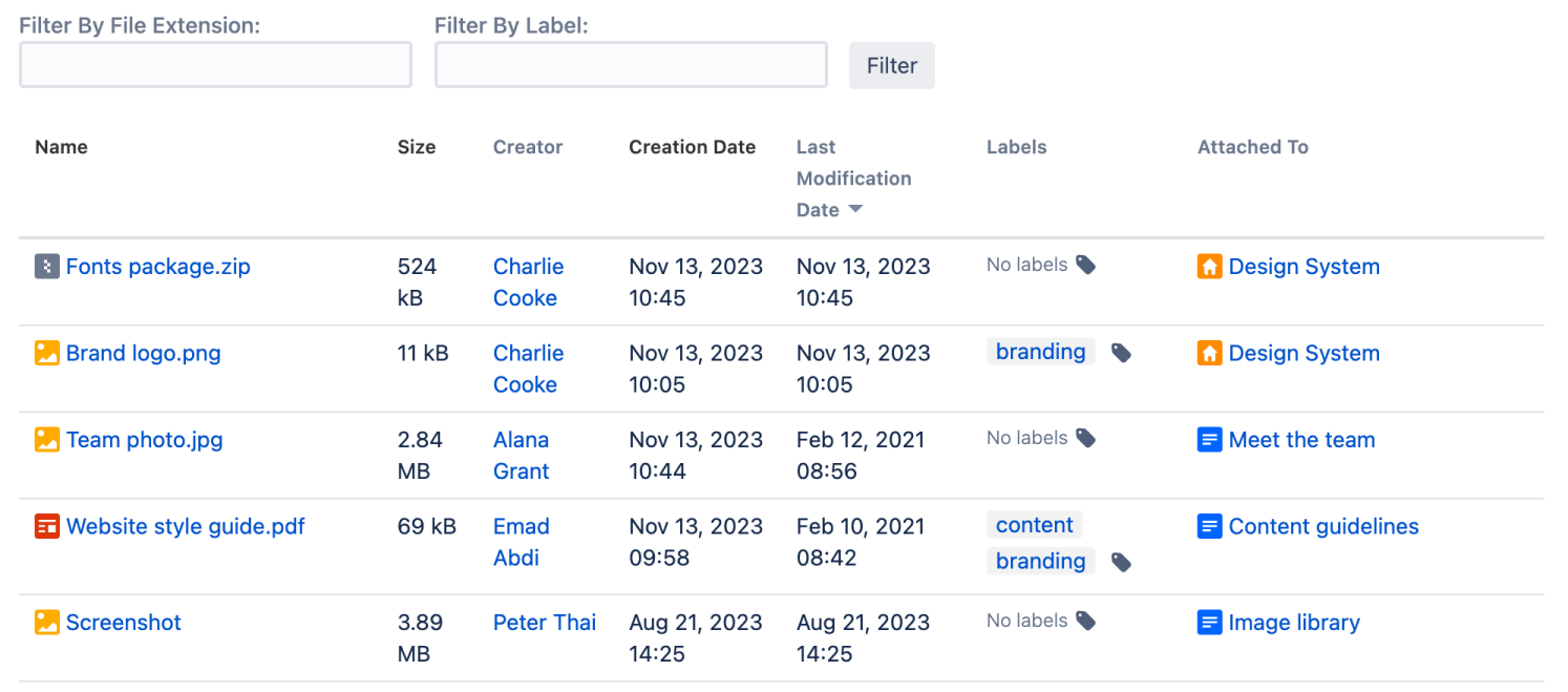 添付したファイルはダウンロード、削除、編集が可能です。Confluence では、新しいファイルをアップロードしたり、添付ファイルの場所を変更したりしたときにも添付ファイルのバージョンが管理されます。