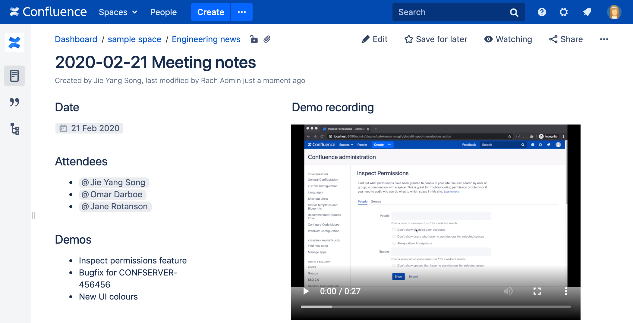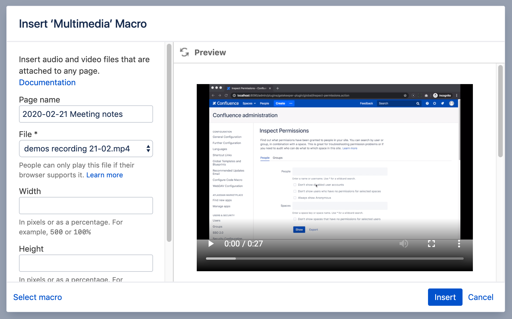 ページ名 (page) | いいえ | 現在のページ | マルチメディア ファイルが添付されているページの名前。ページの名前の入力を開始し、ページ候補の一覧から選択します。別のスペースのページを指定する場合は、スペース キーを含めます (例: MYSPACE:My Page Title) |