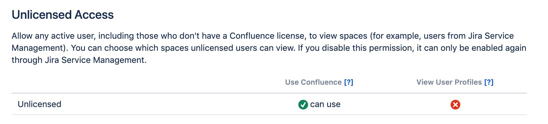 サービス プロジェクトにスペースをナレッジ ベースとしてリンクしており、すべてのアクティブなユーザーや顧客が Confluence のライセンスなしでアクセスできるようにしている場合、このセクションは Confluence のグローバル権限ページにのみ表示されます。