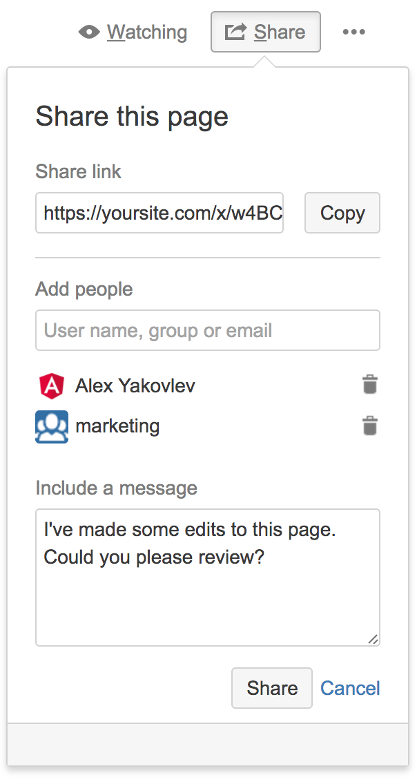 - ページやブログ投稿を編集するために他のユーザーと共有したり、そのユーザーを招待しても、権限が自動的に付与される訳ではありません。Confluence ページにアクセスしてページを表示または編集するためには、適切な Confluence 権限が必要です。