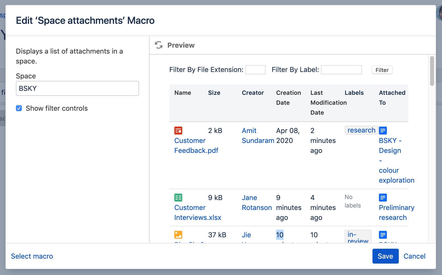 スクリーンショット: 特定のスペースのページに添付されているファイルのみを表示するためのスペースの添付ファイル マクロの設定。