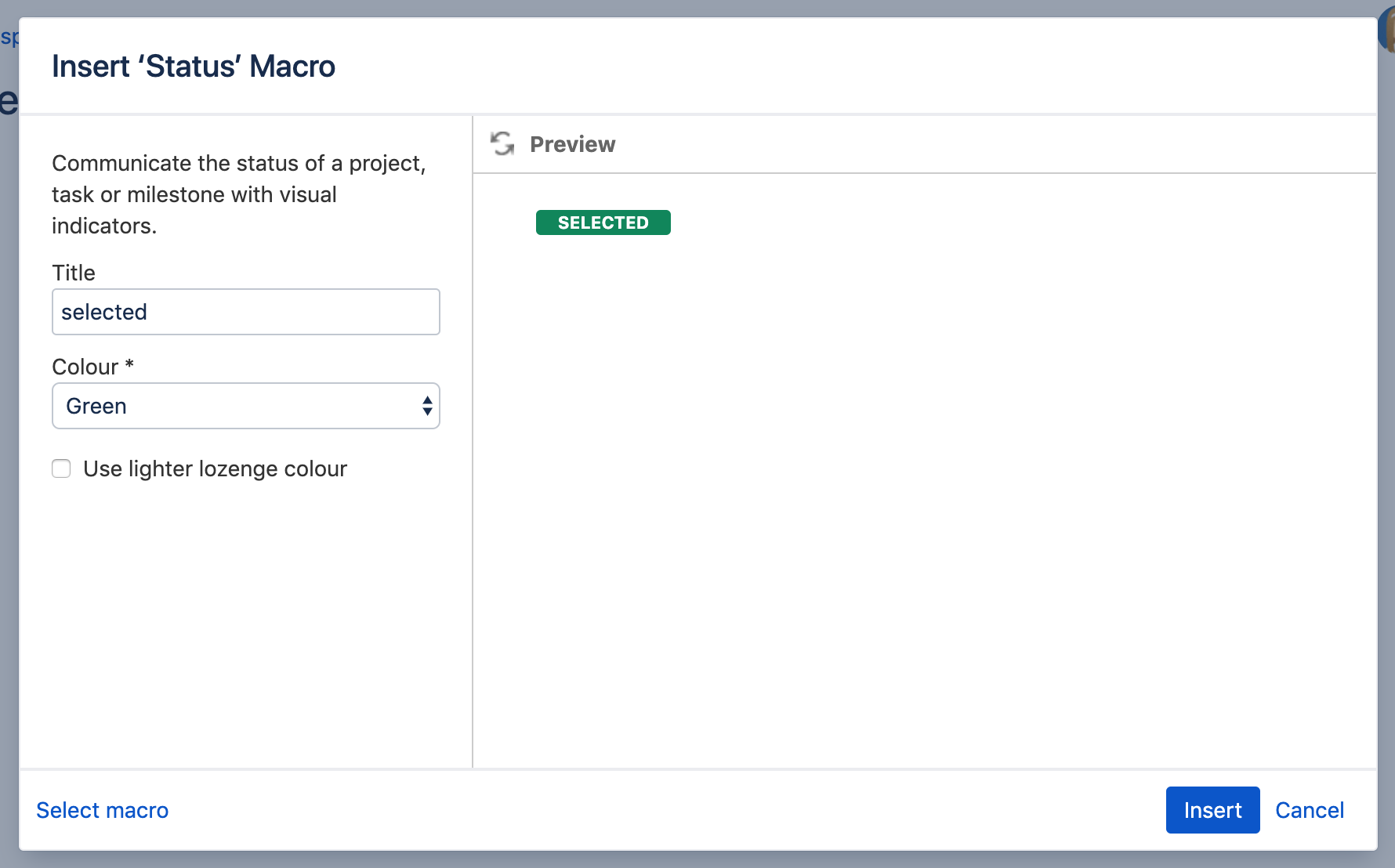 バッジの背景色には濃色と淡色を選択でき、バッジの中に表示するテキストも選択できます。このマクロは現在のステータスをエディタに直接表示します。