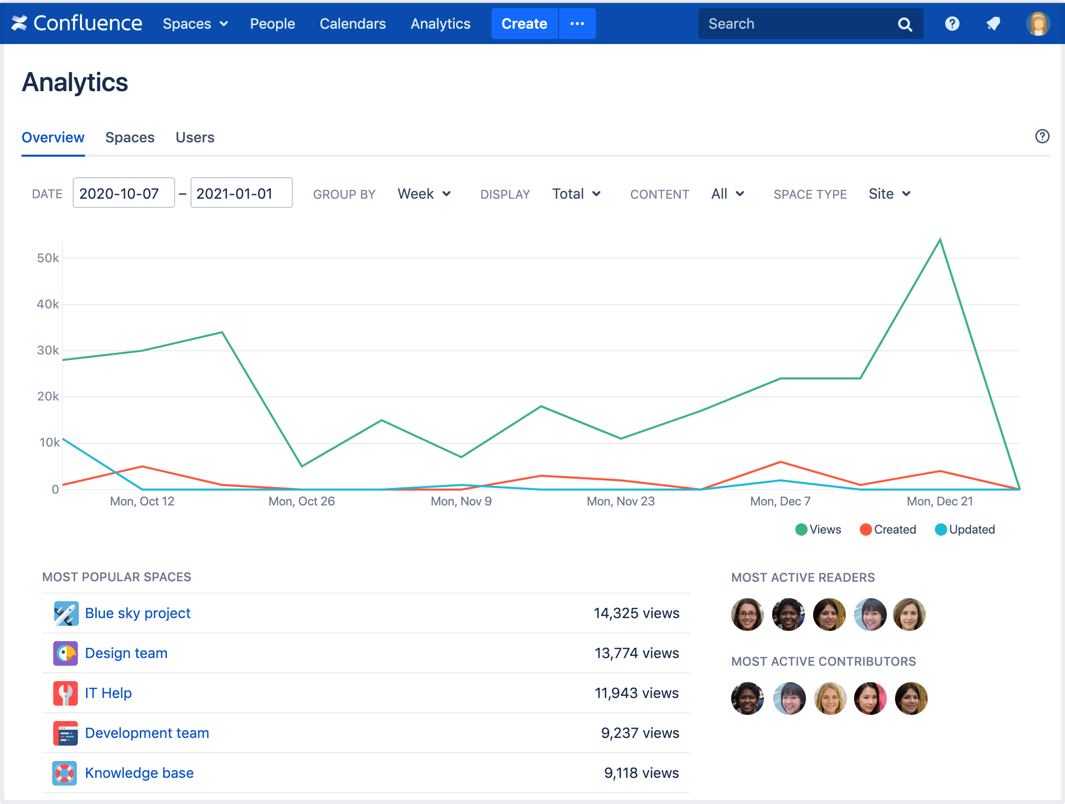 - 上部のフィルターを使用して、データの日付範囲を選択します。データを取得するコンテンツ タイプやスペースも選択できます。たとえば、サイト スペースのページでのユーザーのアクティビティを表示できます。