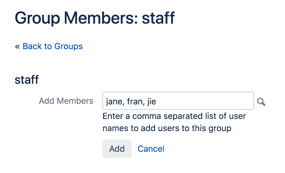 - グループに追加するユーザーのユーザー名を入力します。カンマ区切りで複数のユーザー名を追加できます。