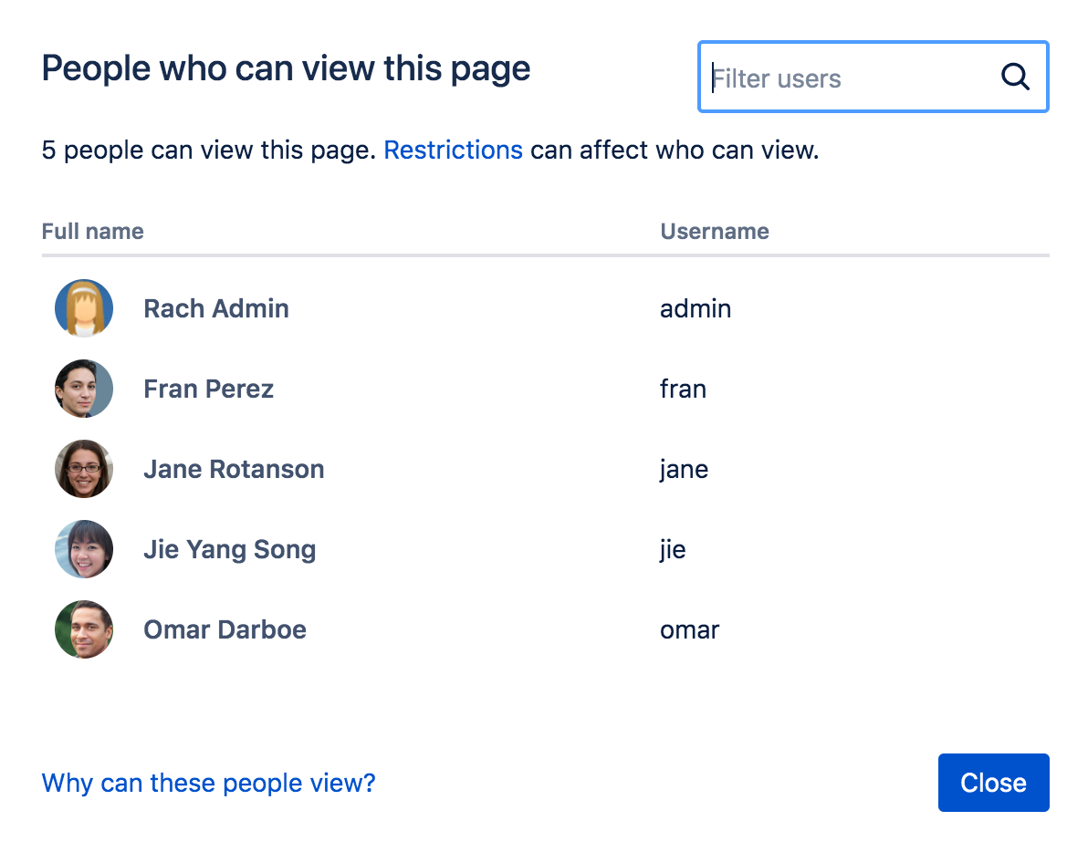 一覧には、すべてのスペースやページを常に表示できる confluence-administrators スーパー グループのメンバーも含まれています。つまり、自身に対してページを制限しても、1 人以上の人物がページを表示できる可能性があります。