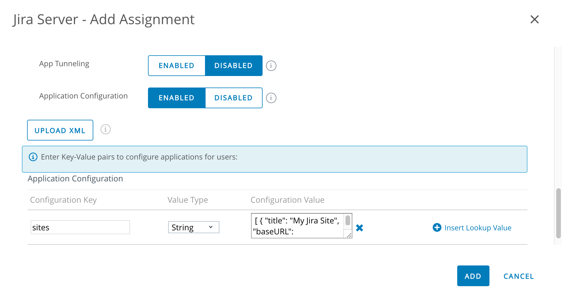 一般的な 2 つの MDM である AirWatch と MobileIron での AppConfig の例は、次のようになります。これらのスクリーンショットは Jira Data Center と Server アプリ用ですが、Confluence でもプロセスは同じです。