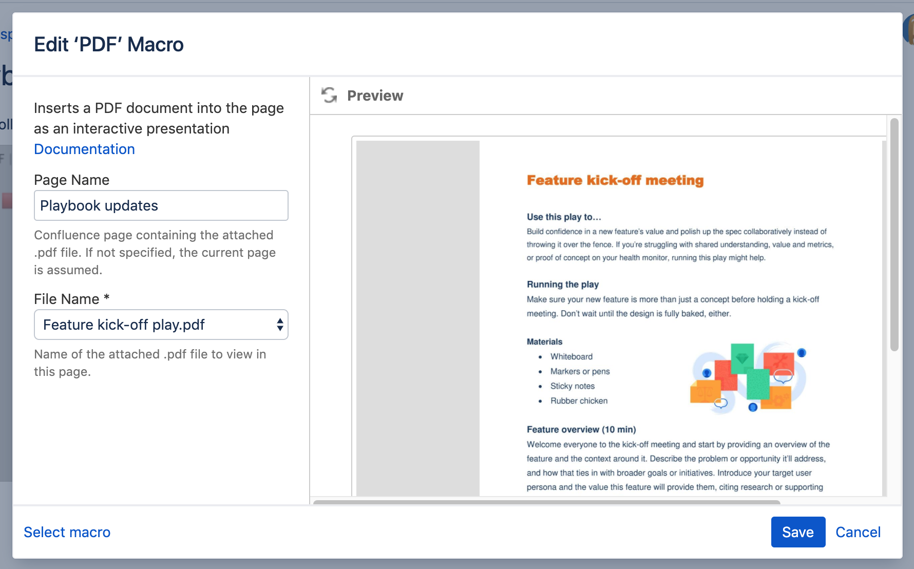 - [Confluence コンテンツ] カテゴリから [PDF] を選択します。