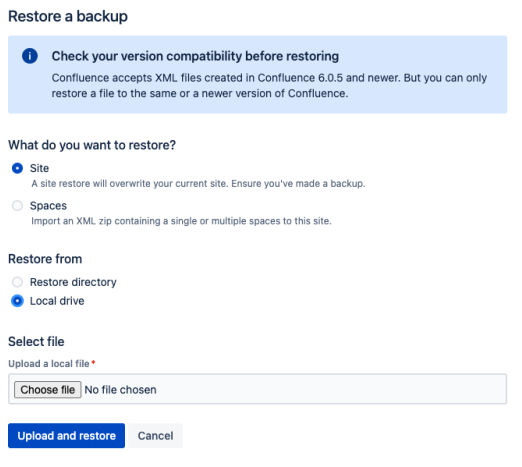 サイトを復元する方法は 2 つあります。ファイルをアップロードする方法 (ローカル ドライブ) と、Confluence Server のディレクトリ (restore ディレクトリ) から復元する方法です。