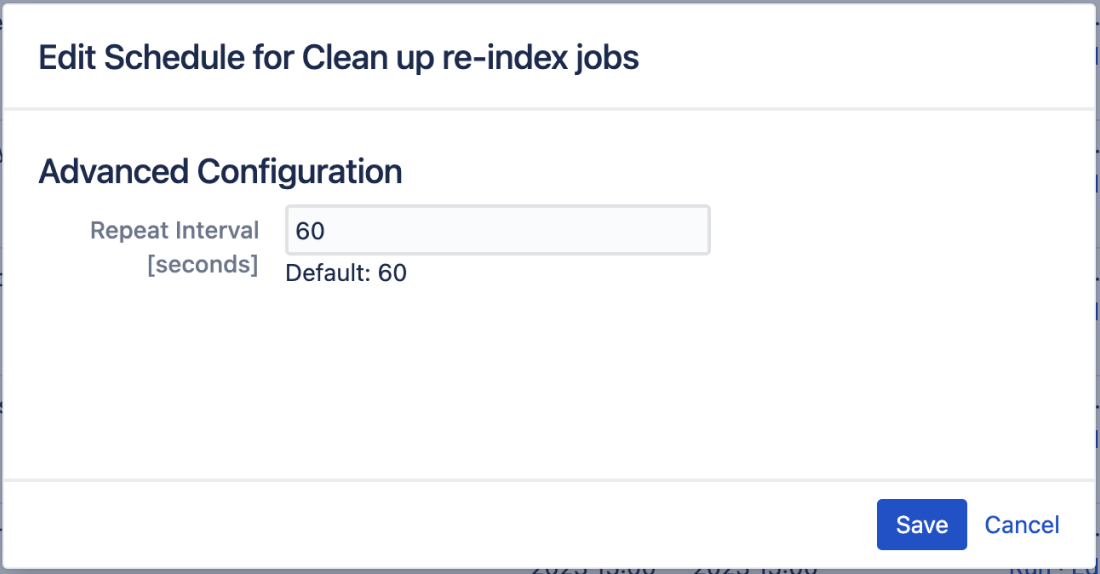 たとえば、単純ジョブ「再インデックスのクリーンアップ ジョブ」を有効化して 60 秒ごとに実行する場合、ジョブが最初に実行されるのはスケジュールを保存してから 60 秒後で、その後は 60 秒が経過するごとに実行されます。