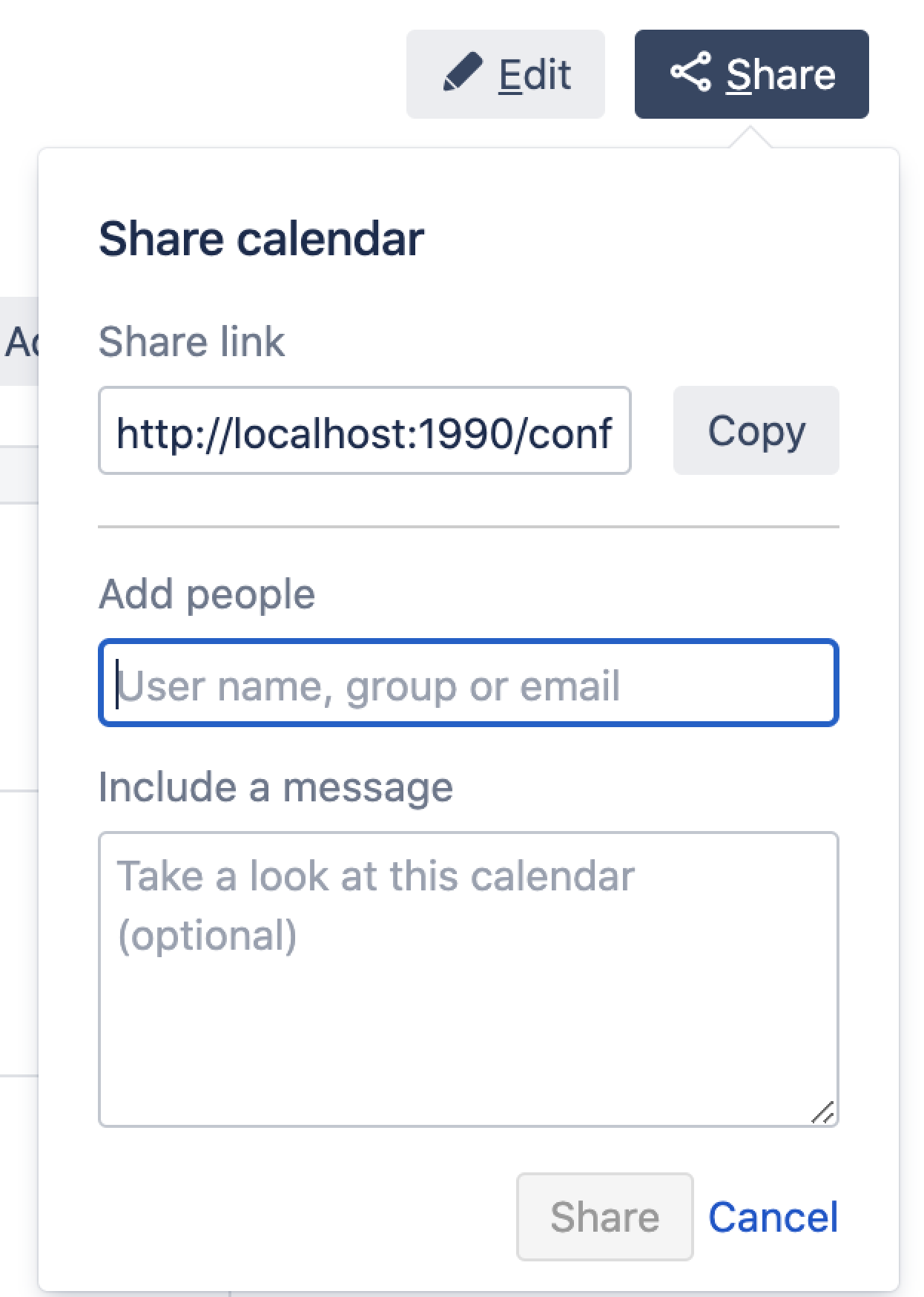 スペースからスペース カレンダー (特定の Confluence スペース内のすべてのカレンダー) または 1 つのカレンダーを表示する場合は、[共有] ボタンを使用して、スペース カレンダーまたは 1 つのカレンダーへのリンクをすべてのユーザーにメールで送信できます。共有ダイアログから共有リンクをコピーするか、Confluence ユーザー、グループ、またはメール アドレスを入力できます。ユーザーを追加するオプションは、サイトにメール サーバーが構成されている場合のみ利用可能です。