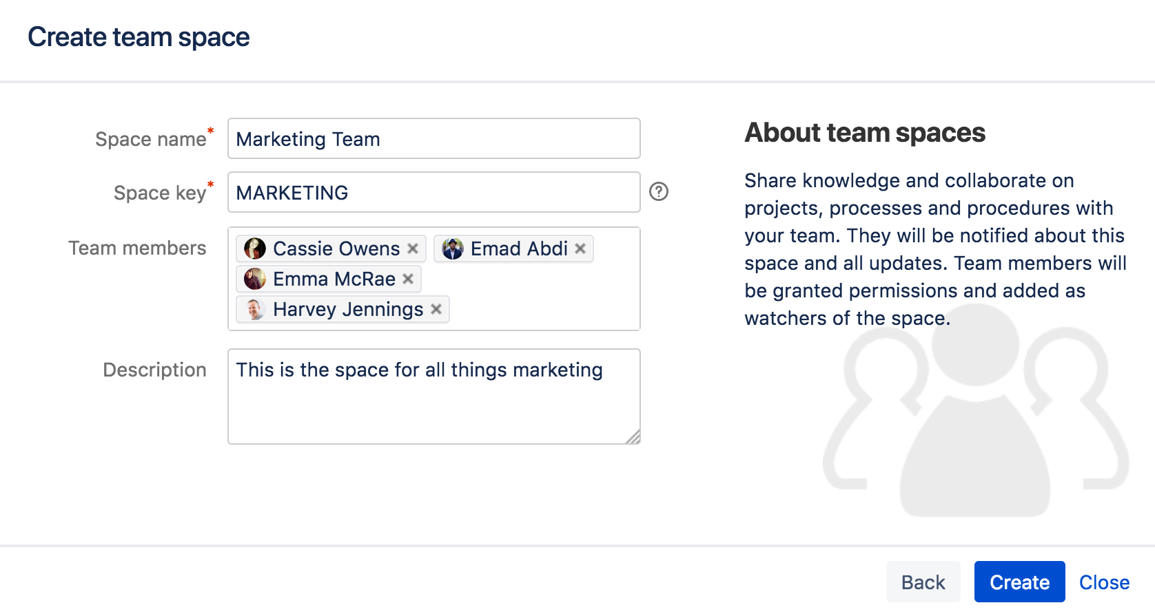 サイト スペースを作成すると Confluenceはスペース キーを提案しますが、覚えやすいように独自のキーを入力することもできます。