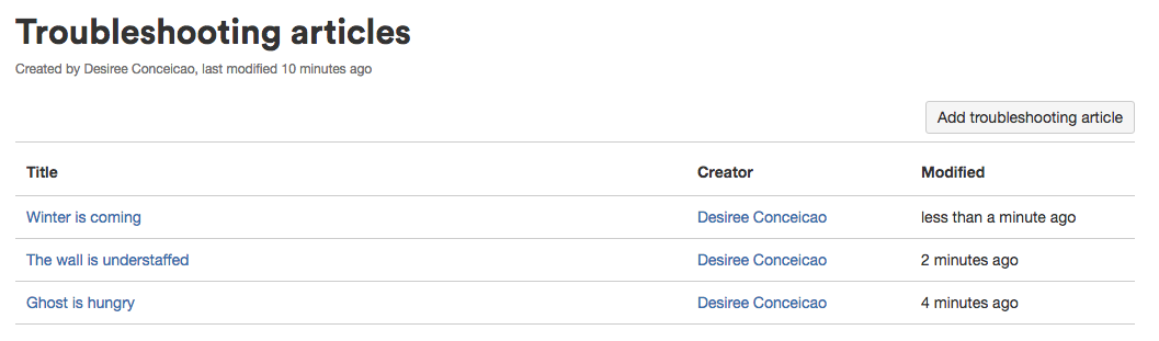 ページを保存すると、Confluence によりインデックス ページが作成され、ショートカットがスペースのサイドバーに追加されます。インデックスは、そのスペース内のすべてのトラブルシューティング記事を一覧表示し、各ページの情報(作成者や変更者など)のサマリを表示します。
