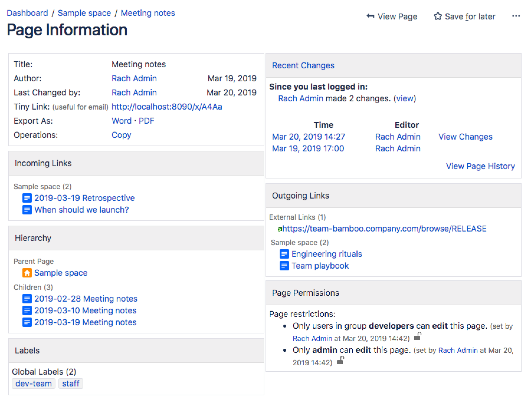 - ページ詳細:タイトル、作成者、作成日、最終変更日、およびページのタイニー リンク (固定リンク)。