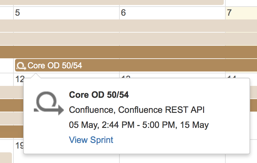 - Jira Software スプリント – チームが Jira Software を使って作業を計画している場合、Team Calendar にスプリントを埋め込むこともできます。スプリントの期間を確認し、スプリントに影響があるチームの稼働状況や他のイベントを確認するのに役立ちます。