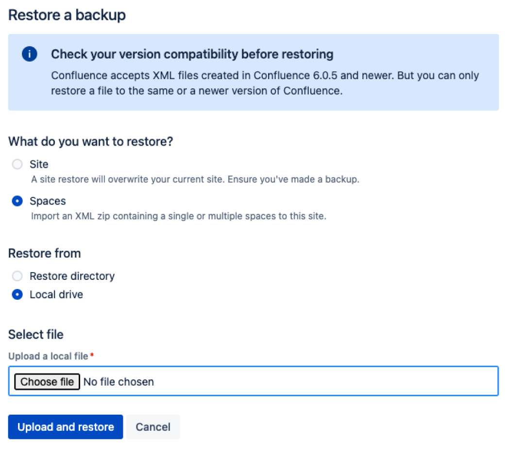 1 つまたは複数のスペースを復元する方法は 2 つあります。ファイルをアップロードする方法 (ローカル ドライブ) と、Confluence Server のディレクトリ (restore ディレクトリ) から復元する方法です。
