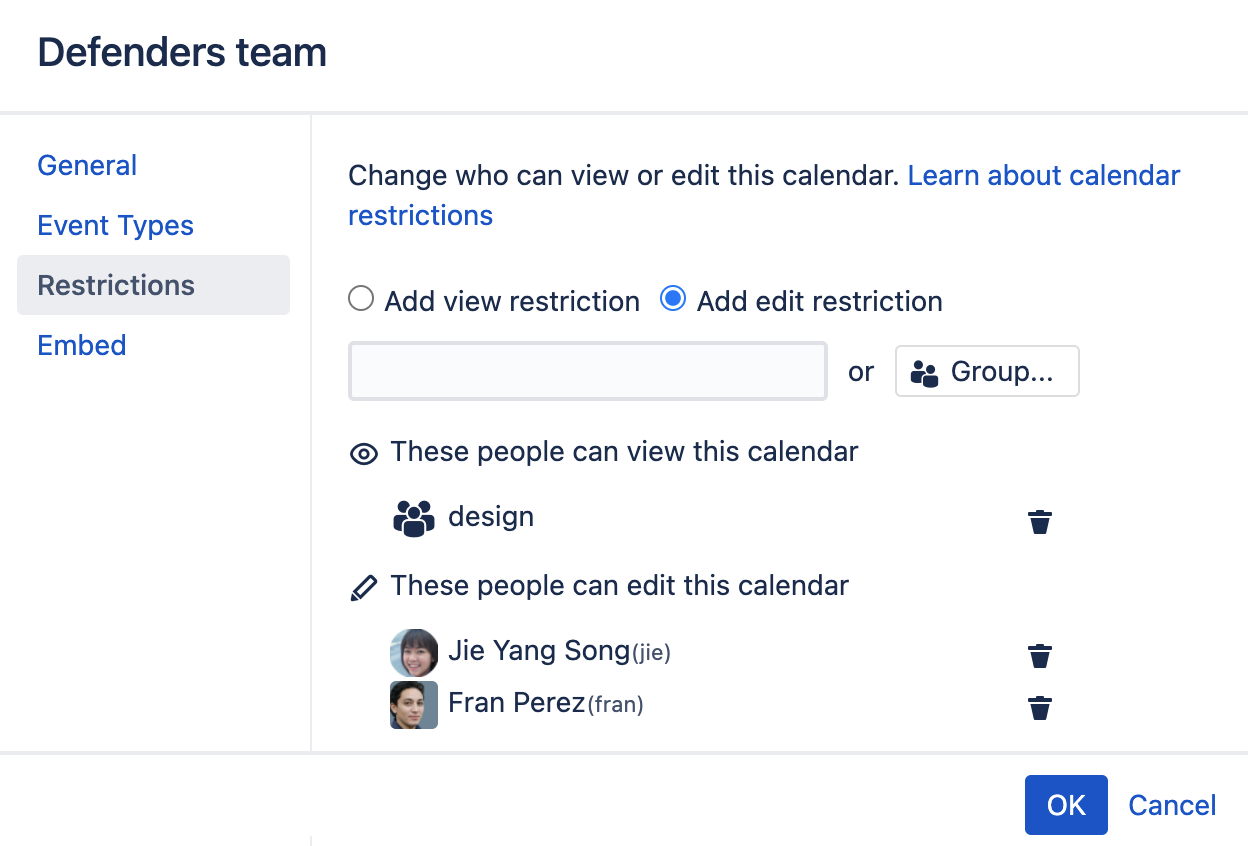 制限ダイアログの [これらのユーザーはこのカレンダーを編集できます] にリストされているユーザー、カレンダーの作成者、(カレンダーを表示できる) スペース管理者のみが、イベントの追加、既存のイベントの編集、制限の変更など、カレンダーを編集できるようになります。