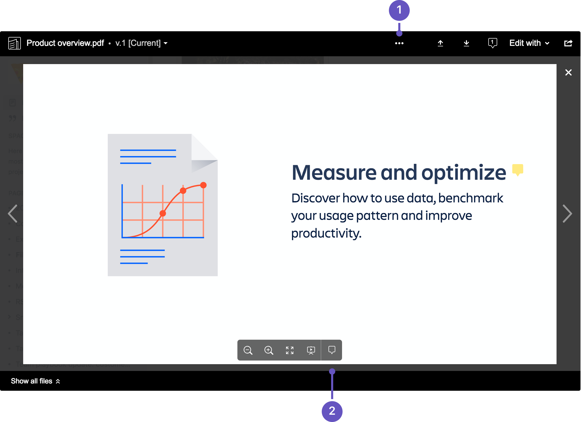 ファイルをプレビューすると、ファイルのそのバージョンの既存のコメントに対するピンが表示されます。コメントを見るには、ピンを選択します。