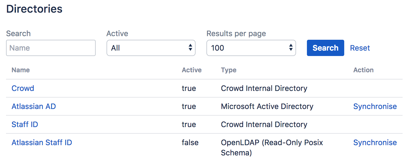 This displays the Directory Browser which shows all the directories that exist in your Crowd system. You can refine your search by specifying a Name (note that this is case-sensitive), or Active/Inactive directories.