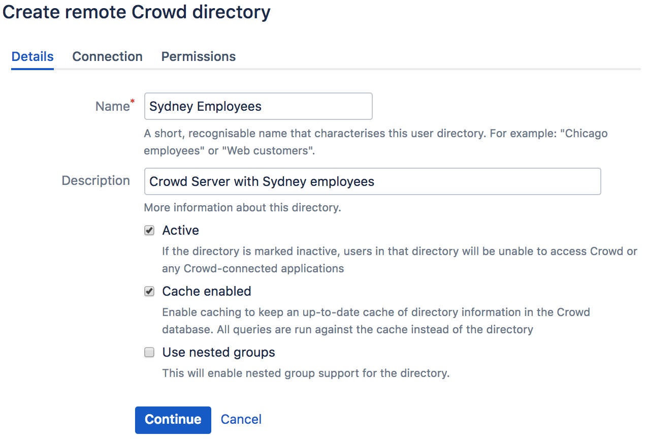 - The new Remote Crowd directory needs to be added to the local Crowd server with details on how to connect to the remote Crowd server.