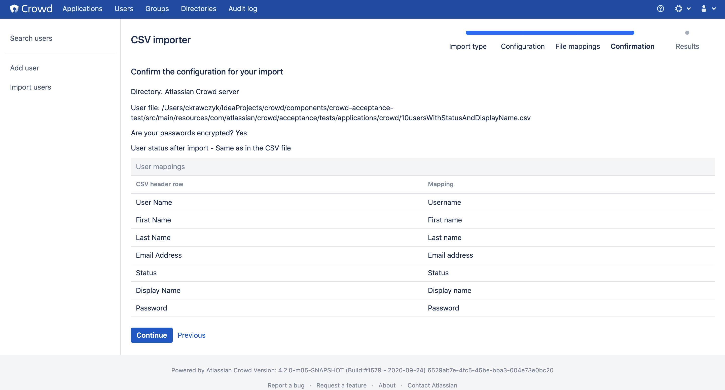 - Click the 'Continue' button to import the users from your CSV file into your Crowd directory.