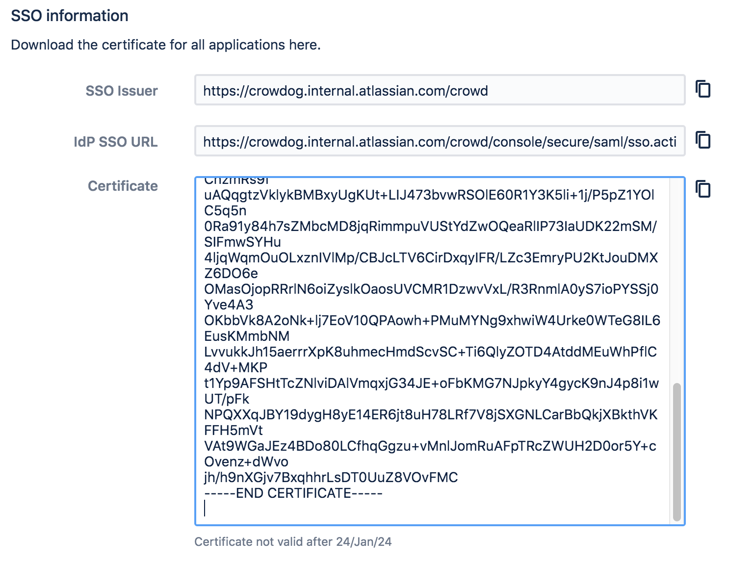 Crowd's certificate is by default valid for 5 years. After that time, you'll have to regenerate the certificate and manually copy it over to individual applications for which you want to use SSO 2.0. In case of a security breach, for safety reasons we suggest that you regenerate the certificate and copy it to your applications immediately. For information on how to reset the certificate, see Crowd REST API Reference.