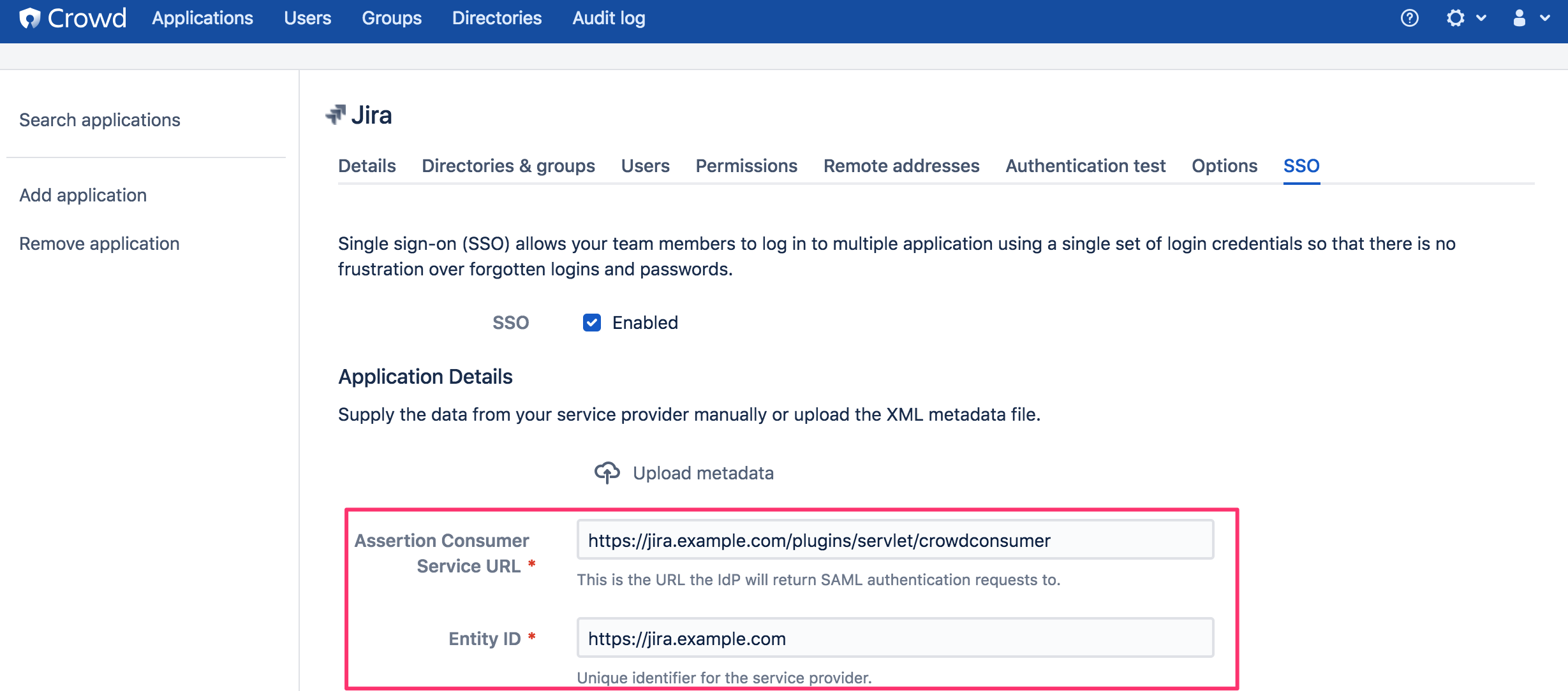 From the Crowd and SAML Single Sign-On 2.0 plugin configuration section in your application, copy the application details.